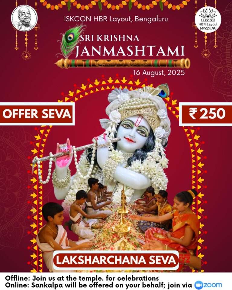 🛕 Offline: Join us at ISKCON HBR Layout, Bengaluru on 16 August between 10:00 AM and 1:00 PM. Sit with the devotee group, chant, and personally offer Tulasi & flowers to the Lord during the Laksharchana. Feel the festival mood of Janmashtami in the temple!